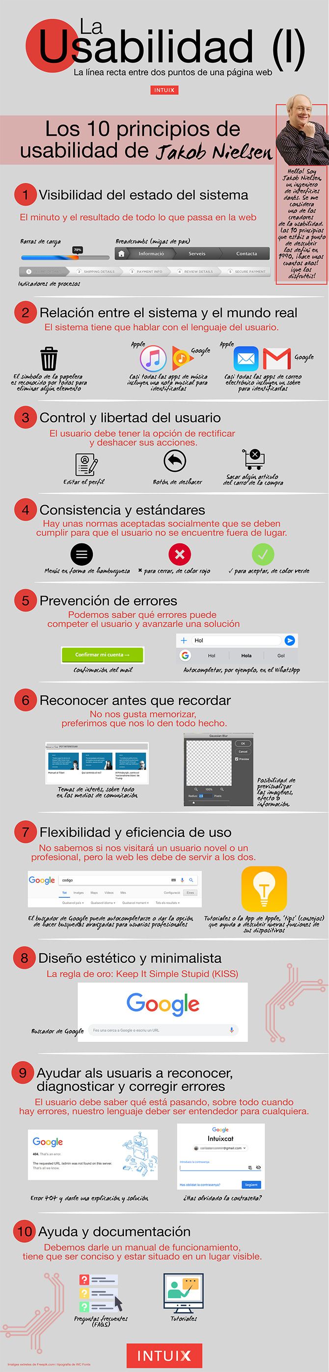 Jakob Nielsen es un ingeniero de interfaces danés que se considera uno de los creadores del concepto de usabilidad. En 1990 definió 10 principios de diseño basados en el usuario que a día de hoy todavía siguen vigentes. Son los siguientes: